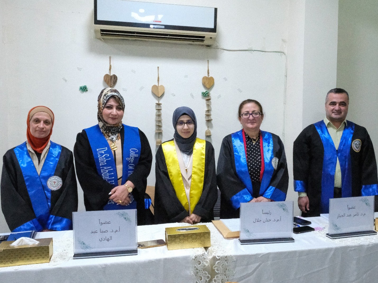The College of Pharmacy discussed the MSc thesis entitled “Formulation and Evaluation of Bilastine Nanosuspension as an Oral Fast Disintegrating Dosage Form” by the student Sarah Adnan Oudah and the supervisor, Assistant Professor Dr. Eman Bakr Al-khedairy, at the pharmaceutics Department. The study aimed to formulate and characterize a nanosuspension formulation of BLA, a Biopharmaceutics Classification System (BCS) Class II drug, to enhance its dissolution rate. Subsequently, the optimized nanosuspension was incorporated into orodispersible films (ODFs) with the aim of improving patient adherence and optimizing therapeutic efficacy. The study included the utilization of the anti-solvent precipitation technique for the preparation of the nanosuspension, employing a range of hydrophilic polymeric stabilizers to ensure formulation stability. The optimized nanosuspension was subsequently incorporated into orodispersible films through the solvent casting method. The results showed that the optimized bilastine nanosuspension, formulated using a 1:1 stabilizer-to-drug ratio with Soluplus®, a solvent-to-antisolvent ratio of 1:6, and subjected to magnetic stirring at 820 rpm, resulted in nanoparticles with a mean particle size of 83.8 nm and a narrow polydispersity index (PDI) of 0.019. This formulation exhibited significantly improved dissolution characteristics, achieving 92.02% drug release in phosphate buffer (pH 6.8) within 90 minutes. The corresponding orodispersible film (ODF), prepared using a 1:1 ratio of polyvinyl alcohol (PVA) to hydroxypropyl methylcellulose E5 (HPMC E5), demonstrated rapid disintegration within 18.3 seconds and released 93.16% of bilastine within six minutes. Furthermore, the ODF maintained its physical stability over a three-month storage period at 25 °C. The study recommended further investigation of the pharmacokinetic and pharmacodynamic profiles of the BLA nanosuspension-based orodispersible film to confirm its in vivo efficacy and bioavailability. Additionally, it emphasized the importance of assessing patient acceptability in comparison to the commercially available bilastine tablet formulation.
