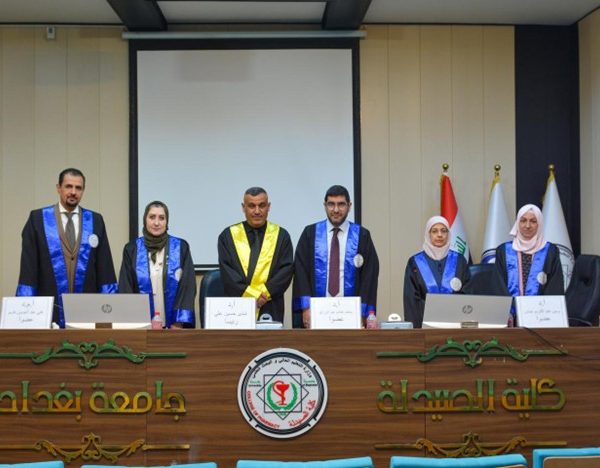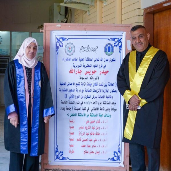 The College of Pharmacy discussed the PhD dissertation entitle “ Association Between Fatty Acid Desaturases Gene Polymorphism And Corresponding Enzymes Plasma Level With Circulating Lipids Grade And Susceptibility to Type Two Diabetes Mellitus in Iraq” by the student Hayder Huwais Jarullah and his supervisor, Professor Dr. Eman Saadi Saleh, at the Clinical Laboratory Sciences Department.The study aimed to assess the distribution of genetic polymorphism of FADS1 (rs174547), FADS2 (rs174576), and FADS3 (rs174455) in type two diabetes mellitus patients compared to healthy control, and the relationship between genetic polymorphism of FADS1, FADS2, and FADS3 genes and enzymatic level of D5D and delta-6 desaturase enzymes. The study included 120 participants, divided into two groups: The newly diagnosed T2DM group, which included 60 individuals, and a control group, which included 60 apparent healthy individuals matched by age, sex, and other relevant sociodemographic variables. The participants were recruited from the Diabetes and Endocrinology Center in Nasiriyah, Dhi-Qar Health Directorate, Iraqi Ministry of Health. The study lasted from March 5, 2024, to October 25, 2024. Approximately 10 ml of venous blood was taken from each subject to assess HbA1c, glucose, insulin, high sensitivity C-reactive protein (hs-CRP), (Apo)-A, Apo B, omega-3 and omega-6 fatty acids, delta-5 and delta-6 desaturase and lipid profile. In addition to DNA extraction and sequencing for specific regain of FADS1, FADS2, and FADS3 was performed. The study concluded that all omega 3 PUFA serum levels (ALA, SDA, ETA, EPA, and DHA) and all omega 6 PUGA serum levels (LA, GLA, DGLA, and AA) were significantly lower in T2DM compared to control. In addition, in FADS1 (rs174547), the genotype and allele frequency significantly differed between control and T2DM, in which C-containing alleles and genotypes were higher in T2DM. The study recommended that gene-wide analysis of the entire region of fatty acid desaturase is necessary to account for all possible confounders; this will facilitate performing a mendelian randomized study later for optimal risk assessment of diabetes.