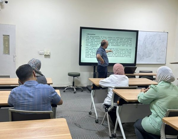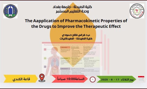 Under the supervision of the Dean of the College of Pharmacy, Professor Dr. Sarmed H. Kathem Alkhateeb, the Continuing Education Unit at the University of Baghdad/College of Pharmacy held an in-person workshop entitled “The Application of Pharmacokinetic Properties of Drugs to Improve Therapeutic Effect”, delivered by the Lecturer Dr. Firas Falih Al-Zubaydi, a faculty member at the Pharmaceutics Department.
