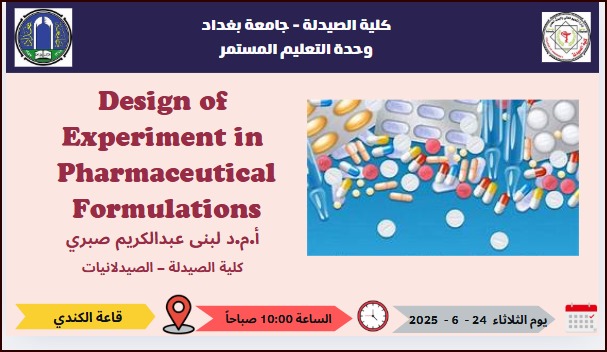 Under the supervision of the Dean of the College of Pharmacy, Professor Dr. Sarmed H. Kathem Alkhateeb, the Continuing Education Unit at the University of Baghdad/College of Pharmacy, held an in-person workshop entitled “Design of Experiment in Pharmaceutical Formulations”, delivered by Assistant Professor Dr. Lubna Abdalkareem Sabri, a faculty member at the Pharmaceutical Department.