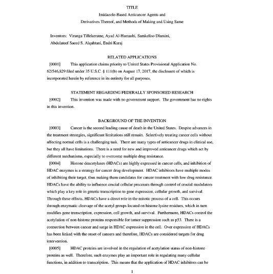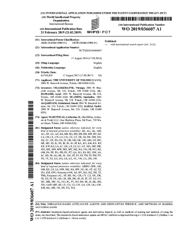 Assistant Professor Dr. Ayad Abd Ali, a faculty member in the Pharmaceutical Chemistry Department, together with a research team from the United States of America, has obtained a patent entitled: “Imidazole-Based Anti-Cancer Agents, Their Derivatives, Methods of Preparation, and Uses.”