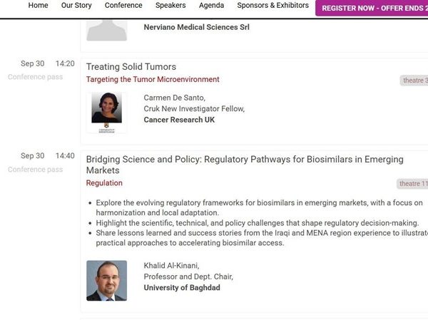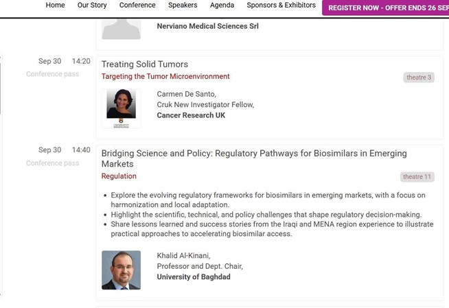 Assistant Professor Dr. Khalid Kadhem Al-Kinani, Head of the Pharmacognosy and Medicinal Plants Department, represented our College and Iraq at one of the world’s leading conferences specialized in biopharmaceuticals, held in Basel, Switzerland, from September 30 to October 2, 2025, upon a direct invitation from the conference organizers.