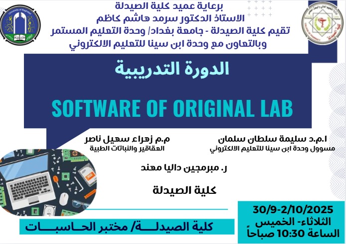 Under the supervision of the Dean of the College of Pharmacy, Professor Dr. Sarmed H. Kadhem Al-Khateeb, the Continuing Education Unit at the College of Pharmacy/ University of Baghdad, organized an in-person training course entitled “Software of Original Lab”, delivered by Asst. Prof. Dr. Salima Salman Sultan, Asst. Lecturer Zahraa Suhail Nasser Hussein, and Head Programmer Dalia Muhannad, faculty members at the College of Pharmacy.