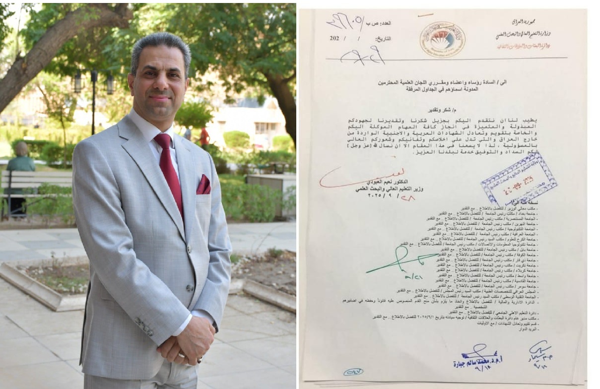 In an achievement that adds to the record of academic leadership of the University of Baghdad College of Pharmacy, Professor Dr. Sarmed H. Kathem Alkhateeb received a letter of appreciation from His Excellency the Minister of Higher Education and Scientific Research, Professor Dr. Naeem Alaboudi, in recognition of his active role and outstanding efforts within the Medical Sciences Committee for the evaluation and equivalence of Arab and foreign certificates.