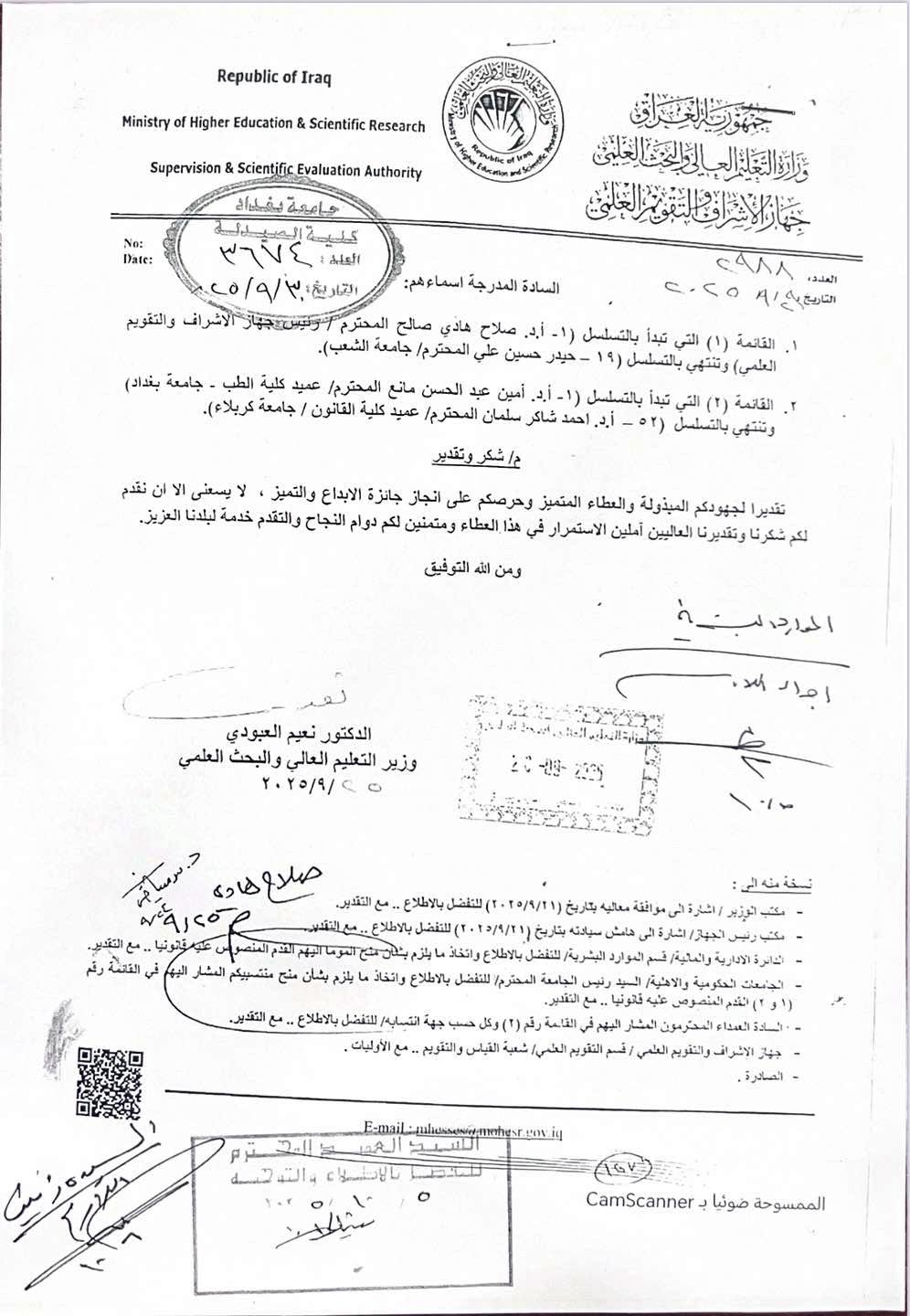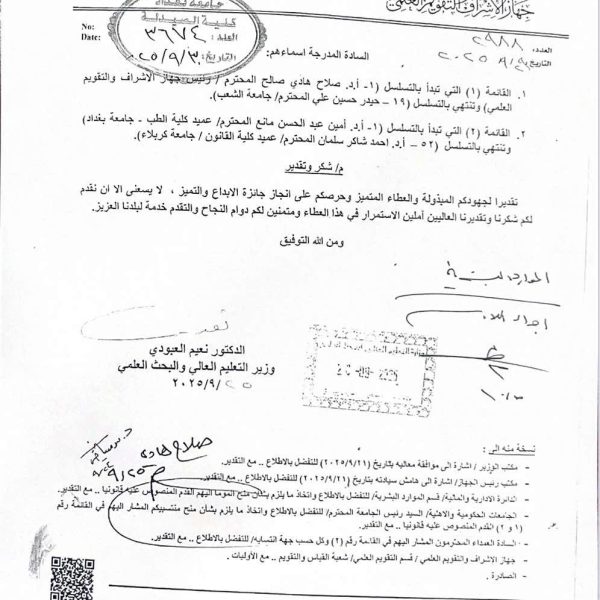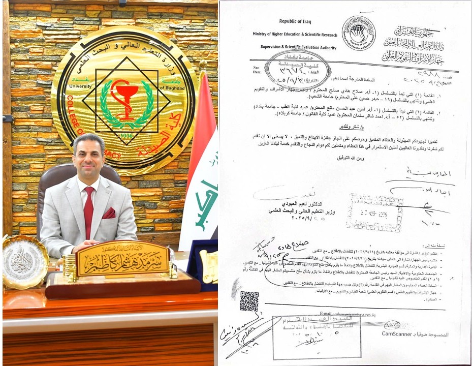 In a gesture of appreciation and support for national academic excellence, the Dean of the College of Pharmacy, Prof. Dr. Sarmed H. Kathem Alkhateeb, received a Letter of Appreciation from His Excellency the Minister of Higher Education and Scientific Research, Prof. Dr. Naeem Alaboudi, in recognition of his distinguished efforts, continuous dedication, and outstanding contribution to the successful organization of the Creativity and Excellence Award.