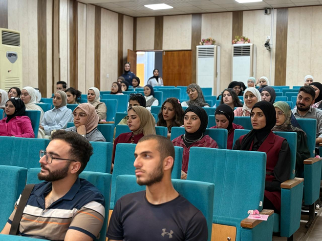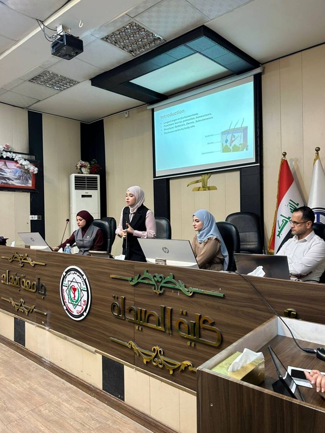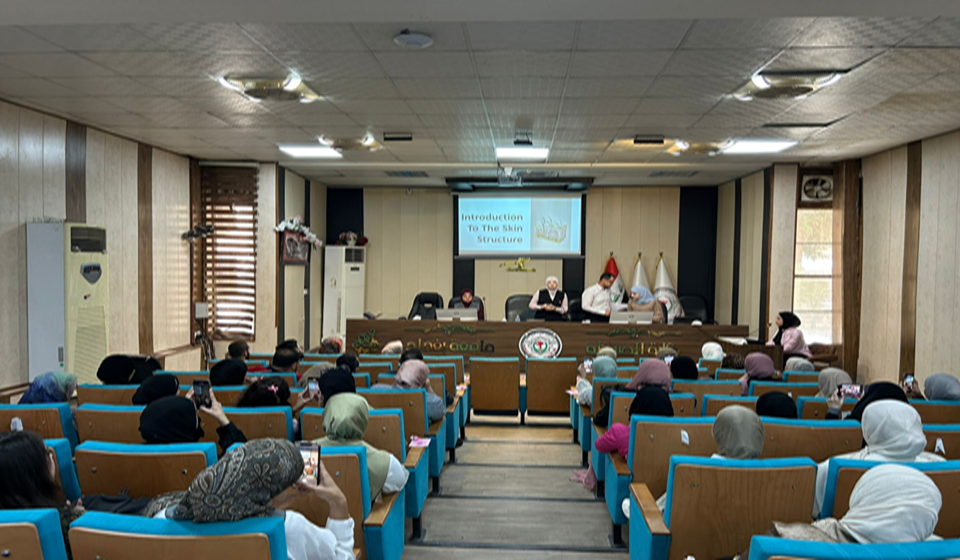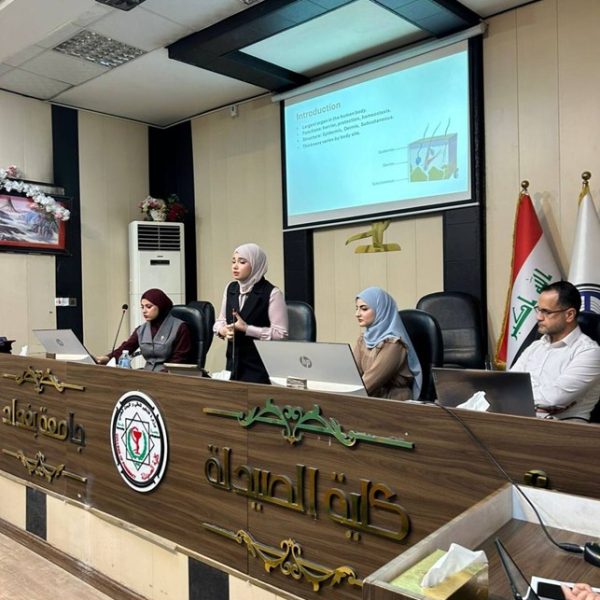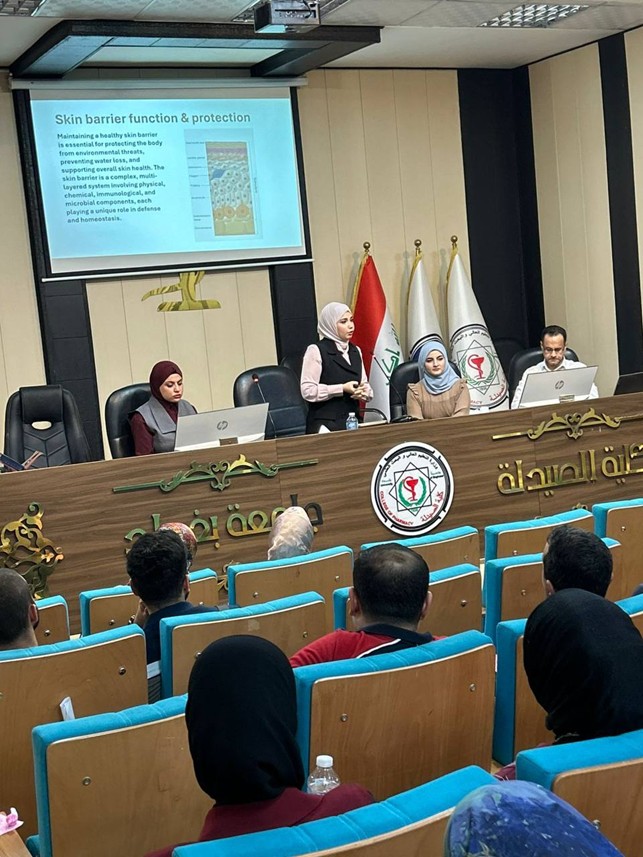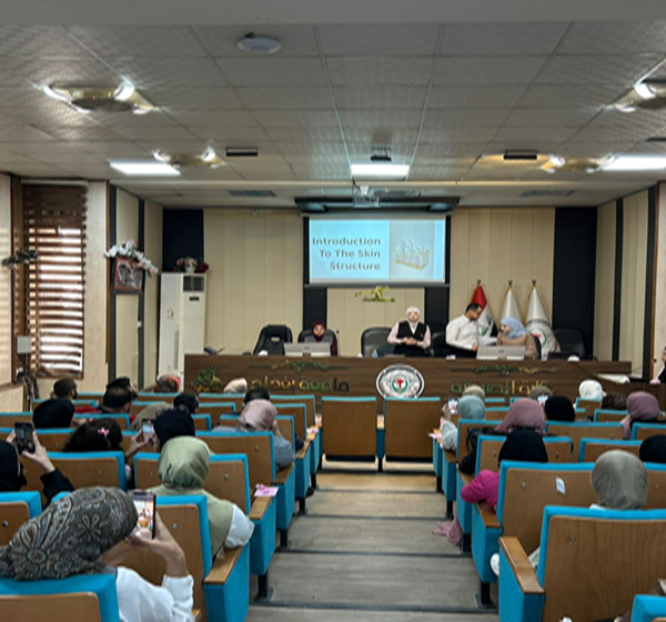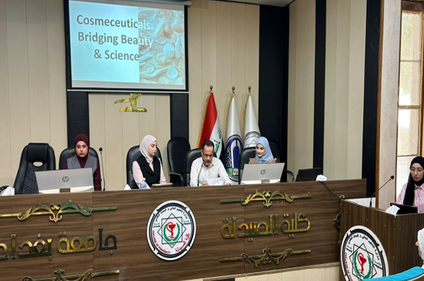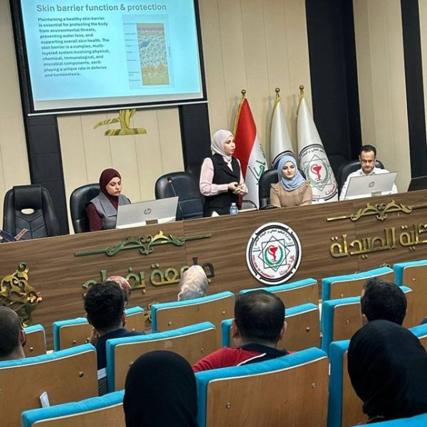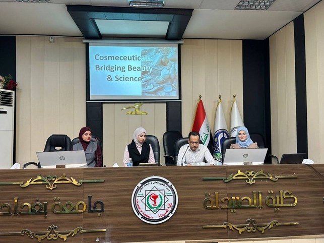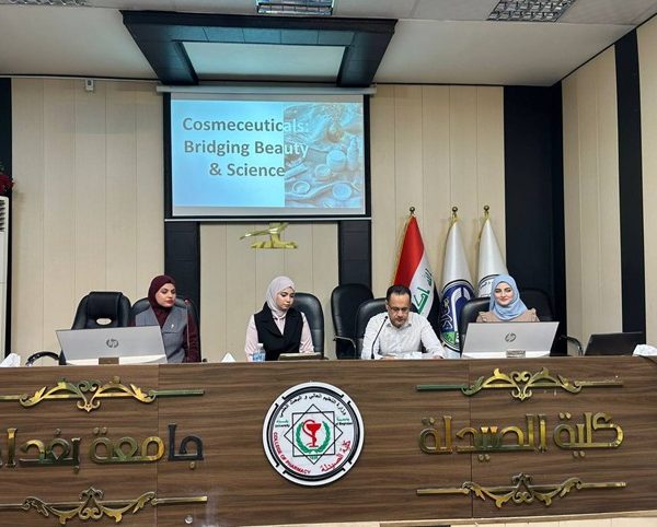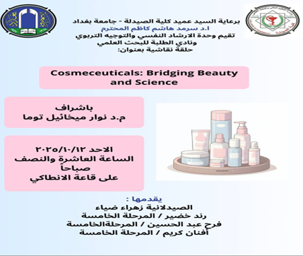 Under the supervision of the Dean of the College of Pharmacy, Professor Dr. Sarmed H. Kathem Alkhateeb, the University Psychological Counseling Unit at the University of Baghdad/College of Pharmacy held a scientific discussion session entitled “Cosmeceuticals: Bridging Beauty and Science,” presented by a group of students from the Pharmacine Club (Student Scientific Research Club), under the supervision of Dr. Nawar Mikhael Toma, lecturer in the Pharmaceutics Department.