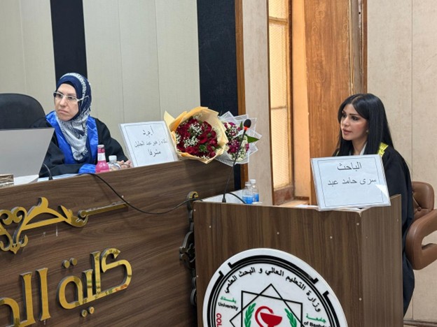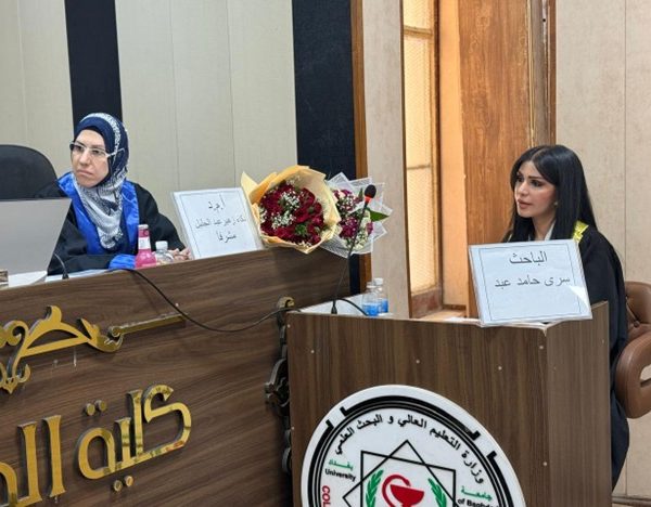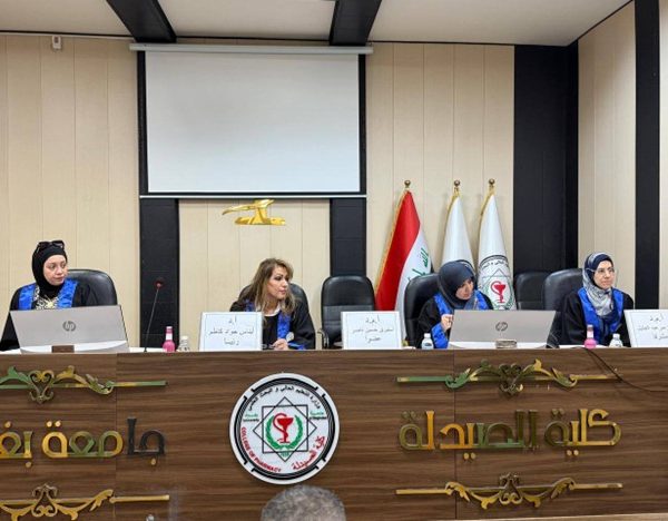 The College of Pharmacy discussed the MSc thesis entitled “Phytochemical Investigation of Iraqi Eichhornia crassipes (Pontederiaceae) and Evaluation of its Cytotoxic Effect” by the student Sura hamid abid and the supervisor Assistant Professor Thukaa Zuhair abdul-jalil, at the Pharmacognosy and Medical Plants Department.