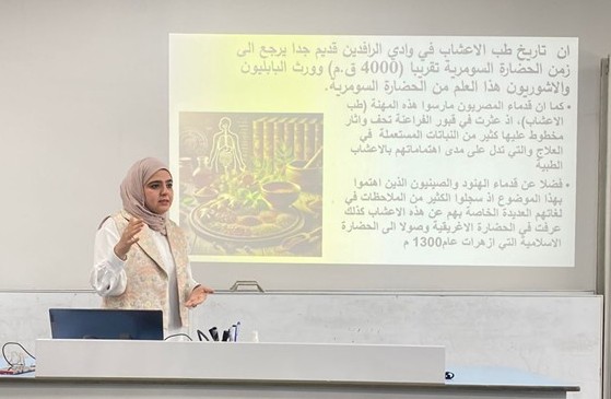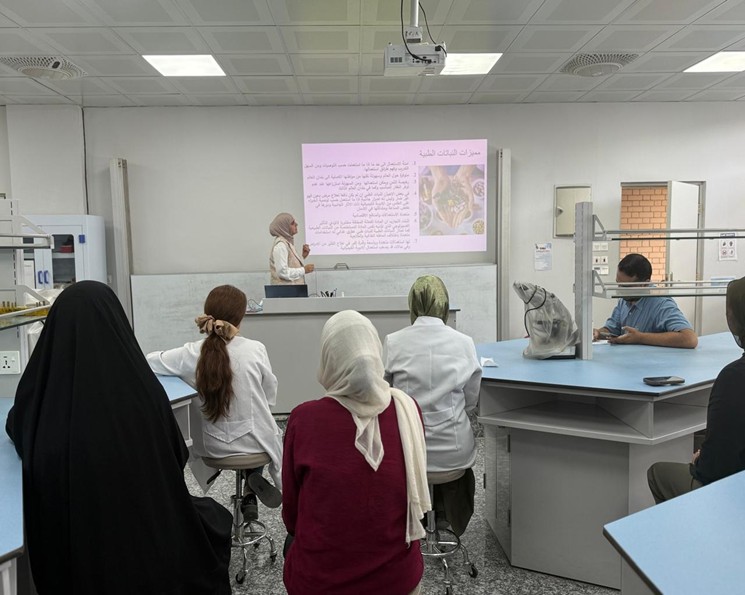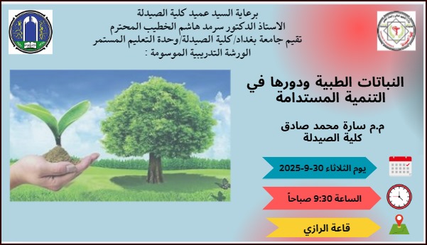 Under the supervision of the Dean of the College of Pharmacy, Professor Dr. Sarmed H. Kadhem Al-Khateeb, the Continuing Education Unit at the College of Pharmacy/ University of Baghdad, held an in-person workshop titled “Medicinal Plants and Their Role in Sustainable Development”, presented by Assistant Lecturer Sarah Mohammed Sadiq, Head of the Planning Unit in the Division of Studies and Planning.