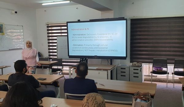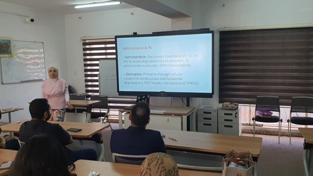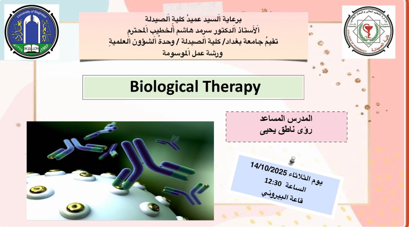 Under the supervision of the Dean of the College of Pharmacy, Professor Dr. Sarmed H. Kathem Alkhateeb, the Scientific Affairs Unit at the University of Baghdad/College of Pharmacy, held an in-person workshop entitled “Biological Therapy”, delivered by Assistant Lecturer Ruaa Natiq Yahya, a faculty member at the Clinical Pharmacy Department.