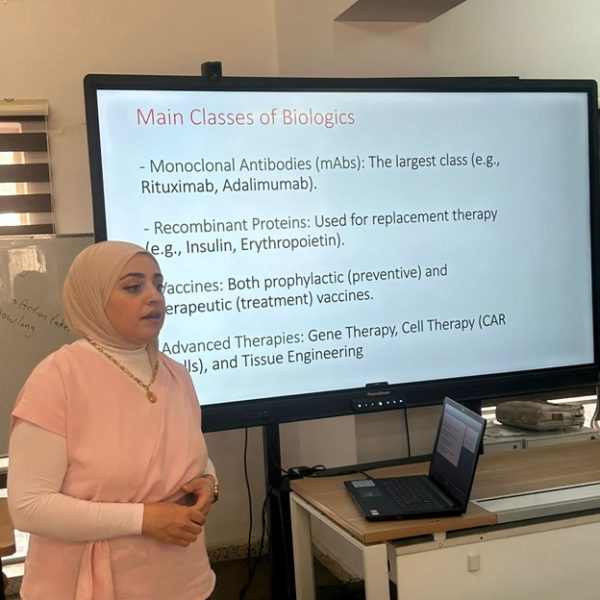 The workshop included several topics, including an explanation of the molecular mechanisms of monoclonal antibodies in the treatment of oncology and autoimmune diseases, as well as the modern chemical structure designs and their impact on the efficacy of this type of therapy. Also, types of biological therapies, such as gene and cell therapy, and their clinical applications were reviewed. Furthermore, the workshop highlighted the differences between conventional drugs and biological therapies in terms of efficacy and side effects, and emphasized the vital role of the pharmacist in counseling and managing the side effects of these treatments.