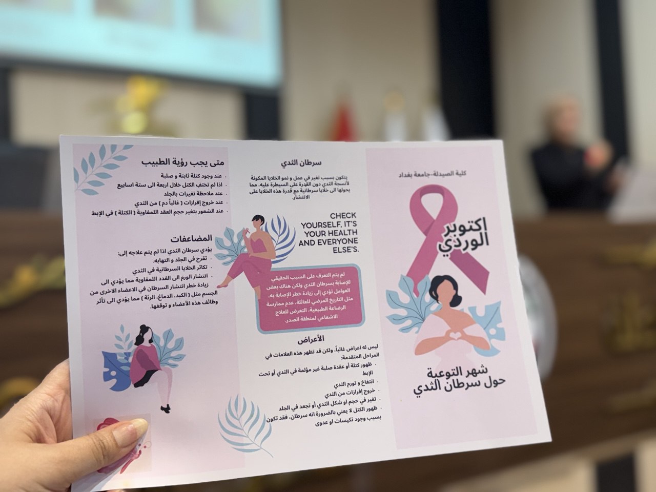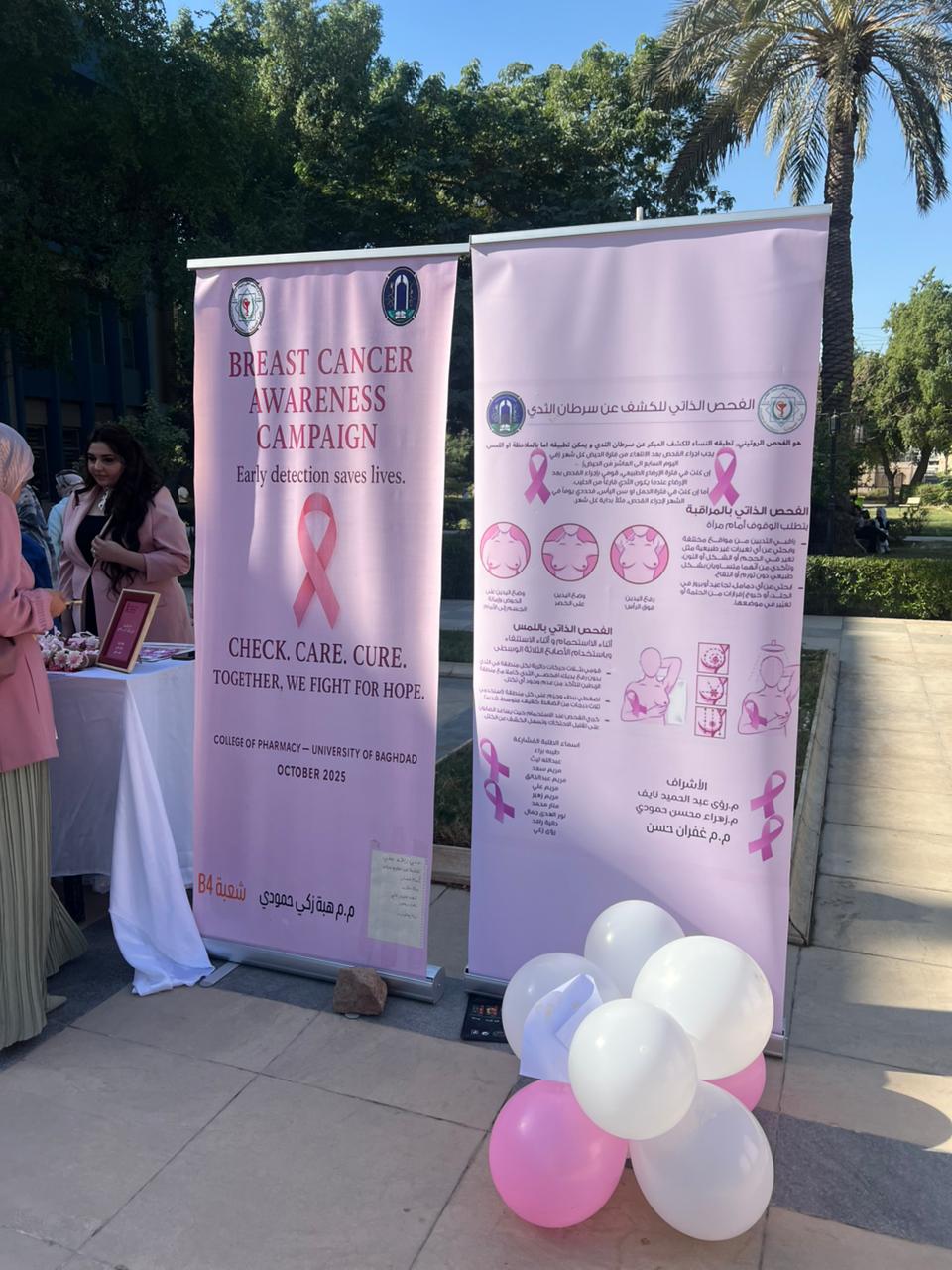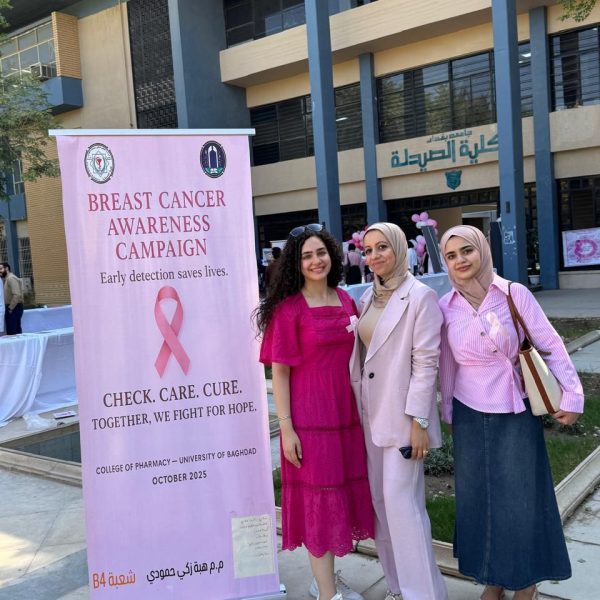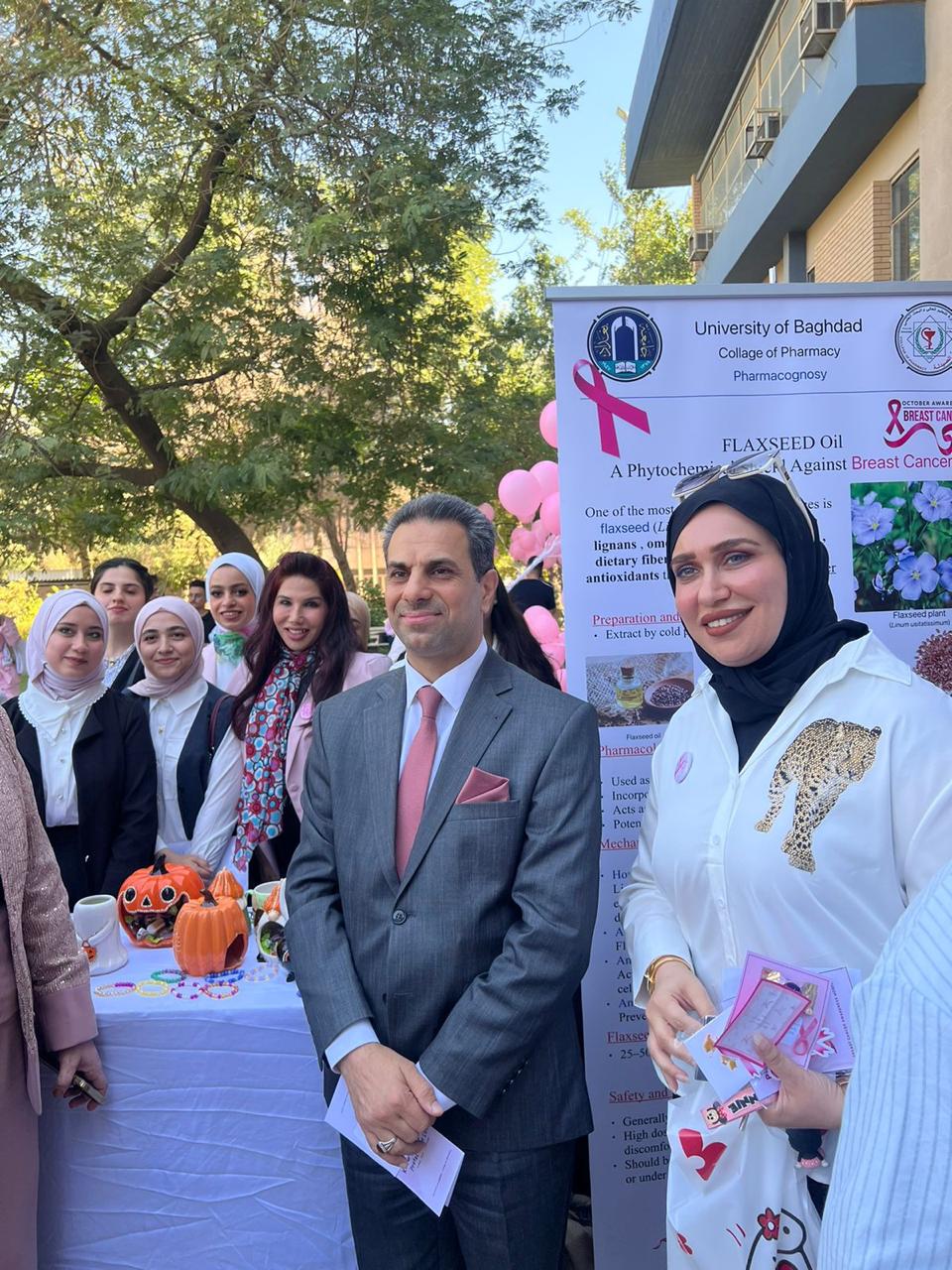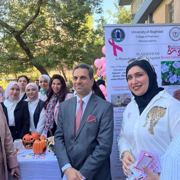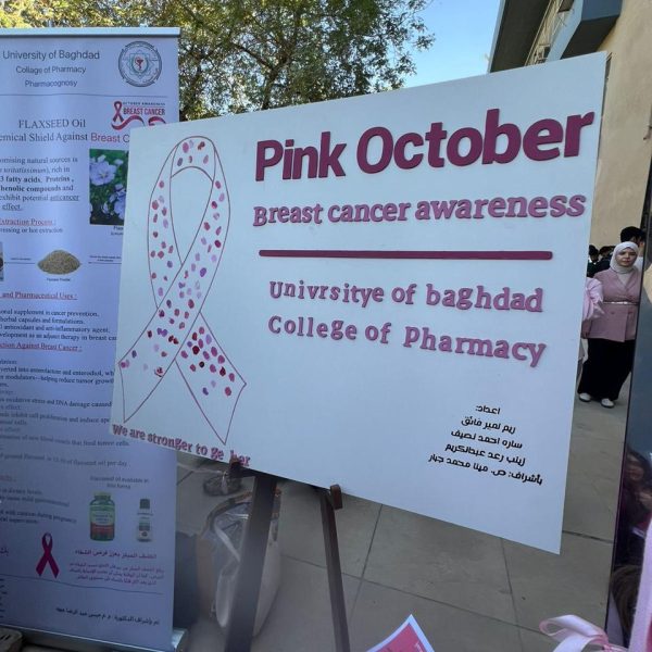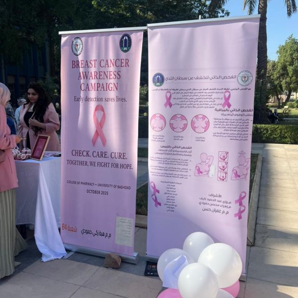 The University Of Baghdad College Of Pharmacy organized an awareness activity on October 28 focusing on the latest updates regarding breast cancer, under the patronage of the esteemed College Deanship and the supervision of the Women’s Affairs Unit, in cooperation with the University Psychological Counseling Unit, the Media and Government Communication Division, and the Voluntary Work Unit.