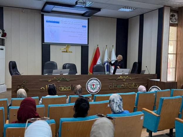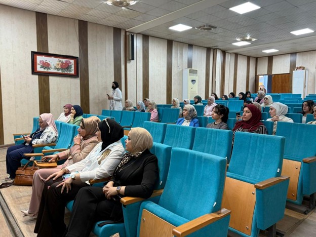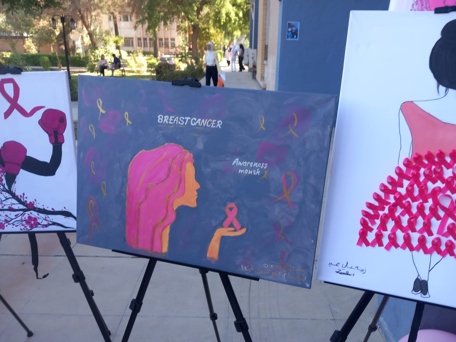 The activity included several segments, beginning with an art exhibition prepared by the creative hands of our students, featuring paintings and handcrafted works related to the occasion, as well as scientific posters that covered various aspects of breast cancer from the importance of early detection and prevention to the available treatment methods prepared by students under the supervision of their instructors. This was followed by a scientific seminar presented by our guest, Dr. Dalia Thamer Ahmed, a lecturer at the Iraqi University. The event concluded with a campus awareness campaign, during which students, accompanied by their instructors, distributed informative leaflets targeting female staff members.