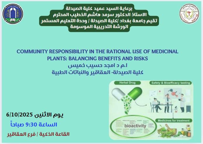 Under the supervision of the Dean of the College of Pharmacy, Professor Dr. Sarmed H. Kathem Alkhateeb, the Continuing Education Unit at the University of Baghdad/College of Pharmacy held an in-person workshop entitled “Community Responsibility in the Rational Use of Medicinal Plants”, delivered by Assistant Professor Dr. Amjed Haseeb Khamees, a faculty member at the Pharmacognosy and Medicinal Plants Department.