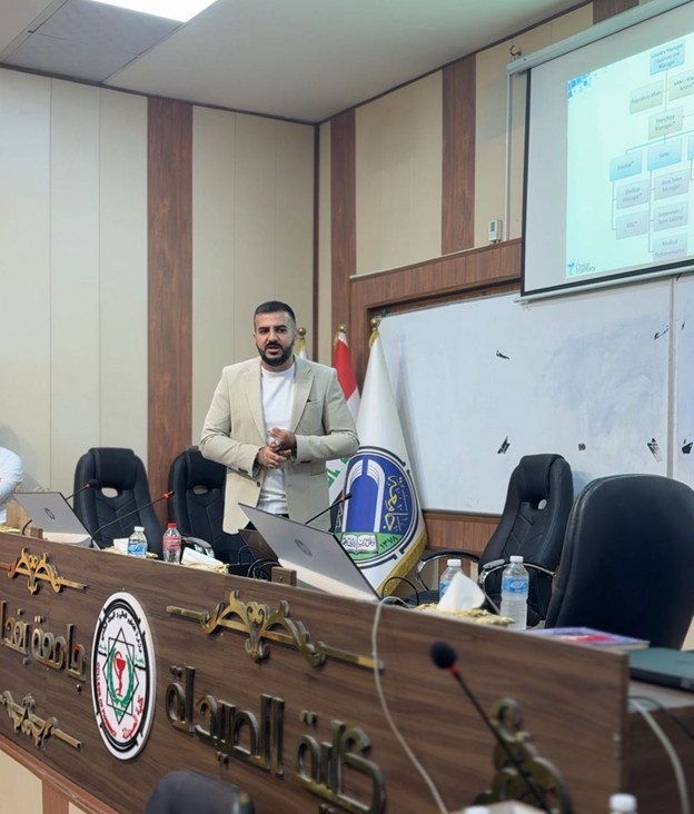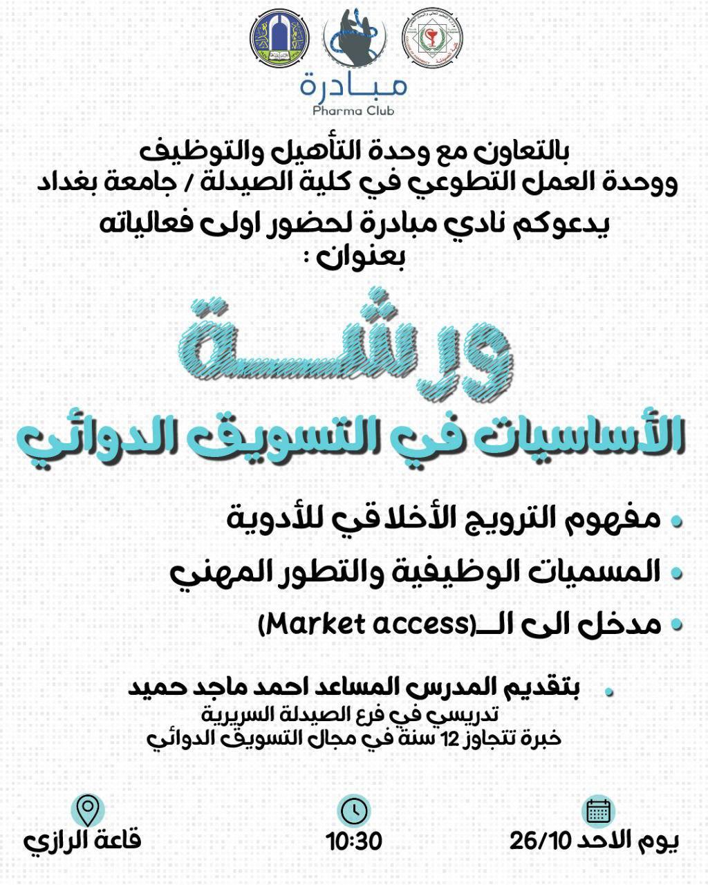 Under the supervision of the Dean of the College of Pharmacy, Professor Dr. Sarmed H. Kathem Alkhateeb, the Rehabilitation and Employment Unit at the University of Baghdad/College of Pharmacy held an in-person workshop entitled “Basics in pharmaceutical promotion” delivered by Assistant Lecturer Ahmed Majid Hameed, a faculty member at the Clinical pharmacy Department.