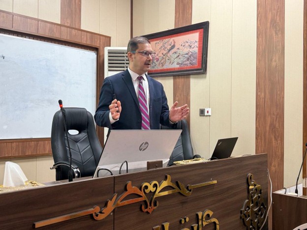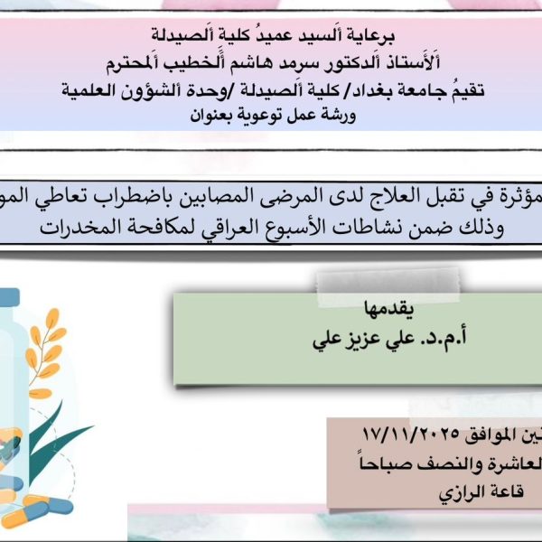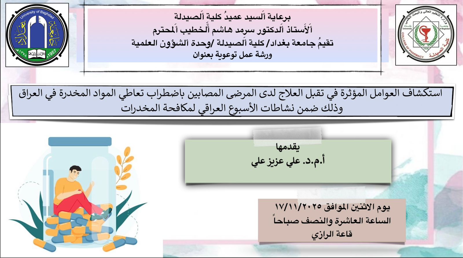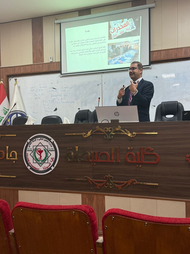 Under the supervision of the Dean of the College of Pharmacy, Professor Dr. Sarmed H. Kadhem Al-Khateeb, the Scientific Affairs Unit at the College of Pharmacy, University of Baghdad, held an in-person workshop titled “Exploring the Factors Influencing Treatment Acceptance among Patients with Substance Use Disorder in Iraq,” delivered by Assistant Professor Dr. Ali Azeez Ali, a faculty member in the Clinical Pharmacy Department.