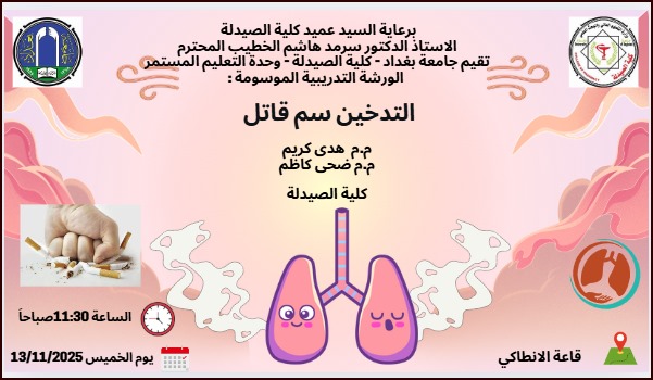 Under the supervision of the Dean of the College of Pharmacy, Professor Dr. Sarmed H. Kathem Alkhateeb, the Continuing Education Unit at the University of Baghdad/College of Pharmacy held an in-person workshop entitled “Smoking is a Silent Killer,” delivered by assistant lecturer Huda Kareem Ahmed, a faculty member at the Pharmaceutical Chemistry Department, and the Assistant Lecturer Dhuha Kazem Salman, a faculty member at the Pharmacognosy and Medical Plants Department.