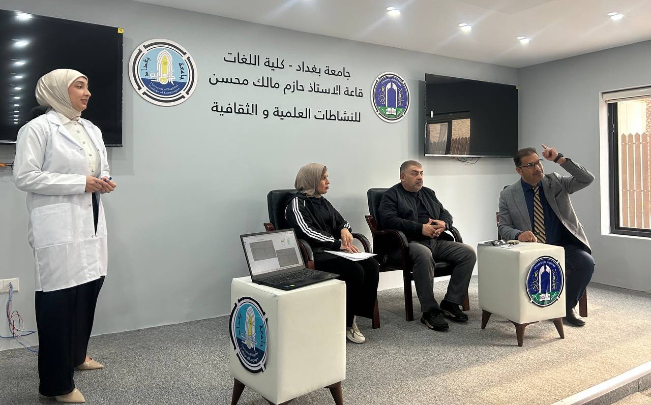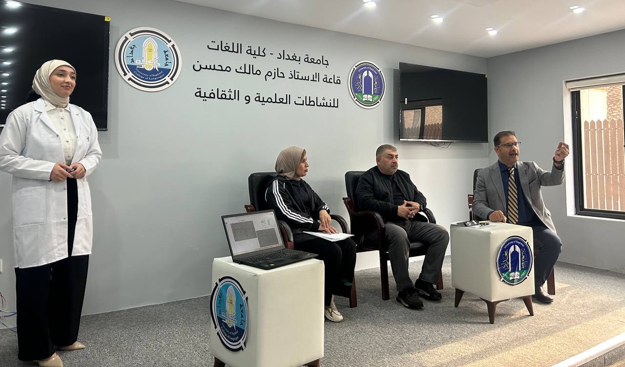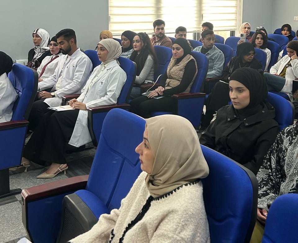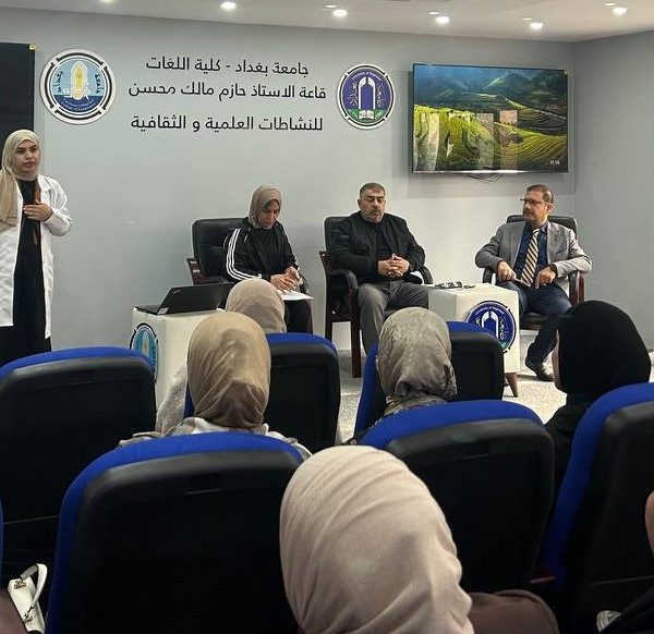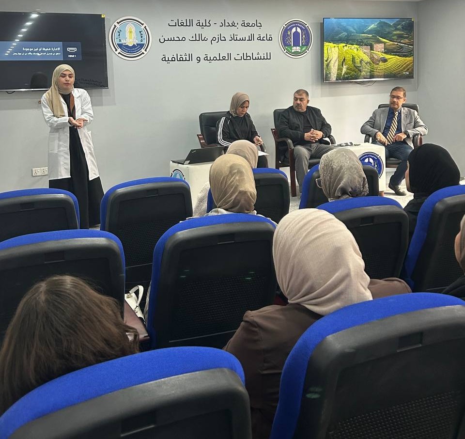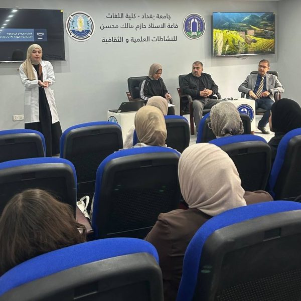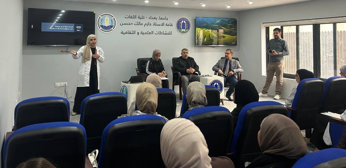 Fourth-year students and Pharm-D third-year students delivered lectures and provided advice to the students of the College of Languages in Dr. Hazim Hall. Their presentations addressed the main causes of bacterial resistance, its negative impact on patient health, the increased cost of treatment, and the emergence of new antibiotic-resistant bacterial strains. They emphasized that Iraq is witnessing a concerning rise in antimicrobial resistance due to the improper use of antibiotics.