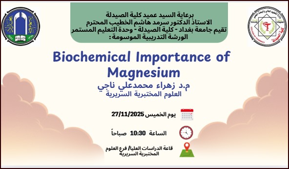 Under the supervision of the Dean of the College of Pharmacy, Professor Dr. Sarmed H. Kadhem Al-Khateeb, the Scientific Affairs Unit at the College of Pharmacy/ University of Baghdad, held an in-person workshop entitled “The Biomedical Importance of Magnesium” delivered by Lecturer Dr. Zahraa Mohammed Ali, a faculty member in the Clinical laboratory Sciences Department.