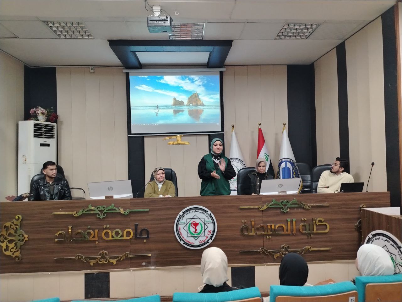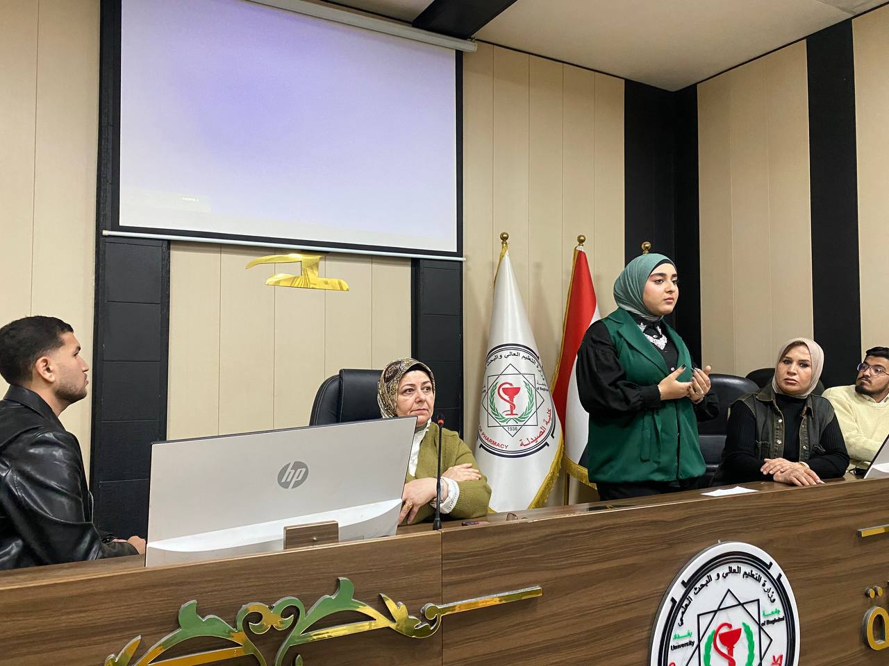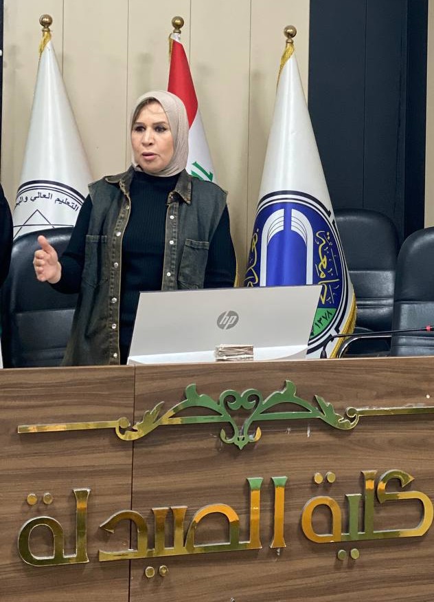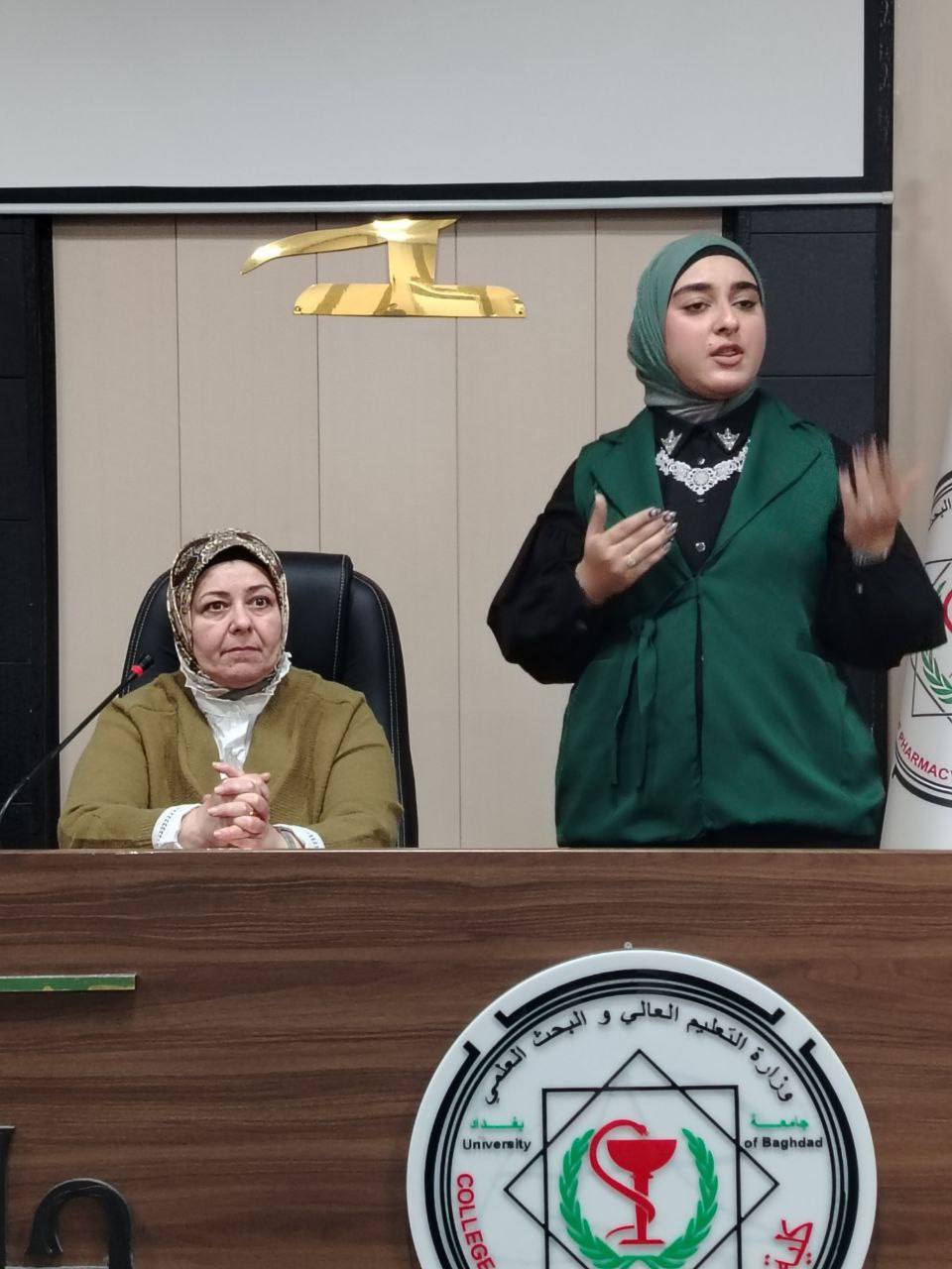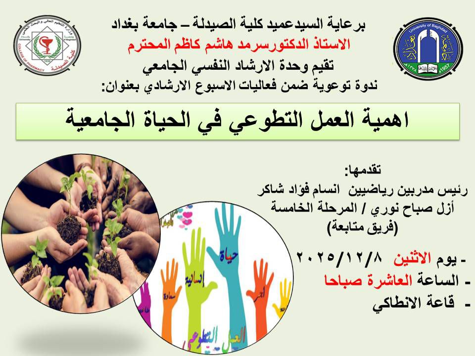 Under the supervision of the Dean of the College of Pharmacy, Professor Dr. Sarmed H. Kathem Alkhateeb, the University Psychological Counseling Unit at the College of Pharmacy/ University of Baghdad held an in-person educational workshop, as part of the activities of the Guidance Week, entitled “The Importance of Volunteer Work in University Life” delivered by Senior Sports Trainer Ansam Fouad Shakir and fifth-year student Azal Sabah Nouri.