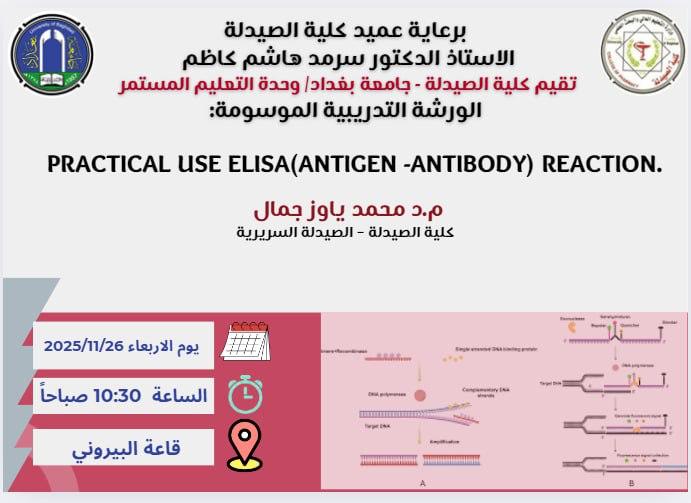 Under the supervision of the Dean of the College of Pharmacy, Professor Dr. Sarmed H. Kathem Alkhateeb, The Continuing Education Unit at the college of Pharmacy/ University of Baghdad held an in-person workshop entitled “Types of Enzyme Linked Immunosorbent Assay” delivered by Lecturer Dr. mohammed yawuz jamal, a faculty member at the clinical pharmacy Department.