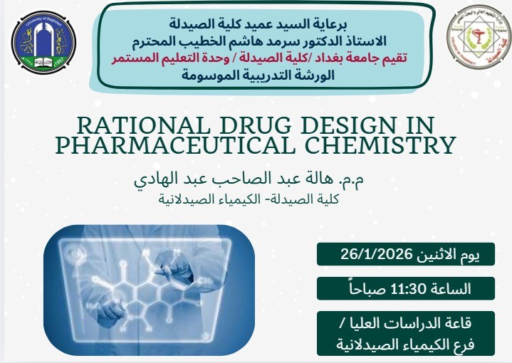 Under the supervision of the Dean of the College of Pharmacy, Professor Dr. Sarmed H. Kathem Alkhateeb, the Continuing Education Unit at the University of Baghdad/College of Pharmacy, held an in-person workshop entitled “Rational Drug Design in Pharmaceutical Chemistry” delivered by Assistant Lecturer Dr. Halah Abdul Sahib, a faculty member at the Pharmaceutical Chemistry Department.