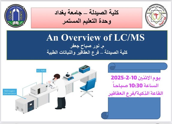 Under the supervision of the Dean of the College of Pharmacy, Professor Dr. Sarmed H. Kathem Alkhateeb, the Continuing Education Unit at the University of Baghdad/College of Pharmacy, held an in-person workshop entitled “An Overview of Liquid Chromatography/Mass Spectrometry Technique (LC/MS),” delivered by Assistant Professor Dr. Nour Sabah Jaafar, a faculty member at the Pharmacognosy and Medicinal Plants Department. The workshop aimed to define the liquid chromatography/mass spectrometry technique. The workshop included several topics, including a general description of the technique, its working mechanism, the components of the instrument, the stationary and mobile phases used in this technique, and the characteristics and type of samples used with each phase. In the LC/MS technique, the constituents of a liquid sample are partitioned between two immiscible phases (stationary phase and mobile phase). Following separation, the analytes undergo ionization. The mass analyzer then resolves these ions according to their mass-to-charge ratio. The workshop concluded that LC/MS is a highly precise analytical tool that plays a crucial role in determining the molecular structure of unknown compounds through fragmentation analysis. It also provides highly accurate chemical structure information, making it essential in pharmaceutical and analytical applications.