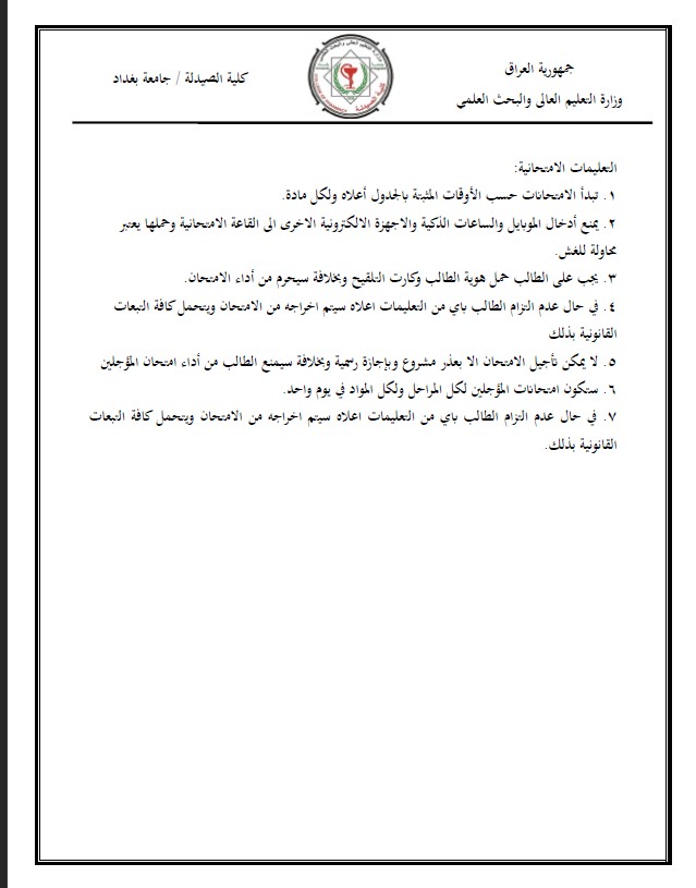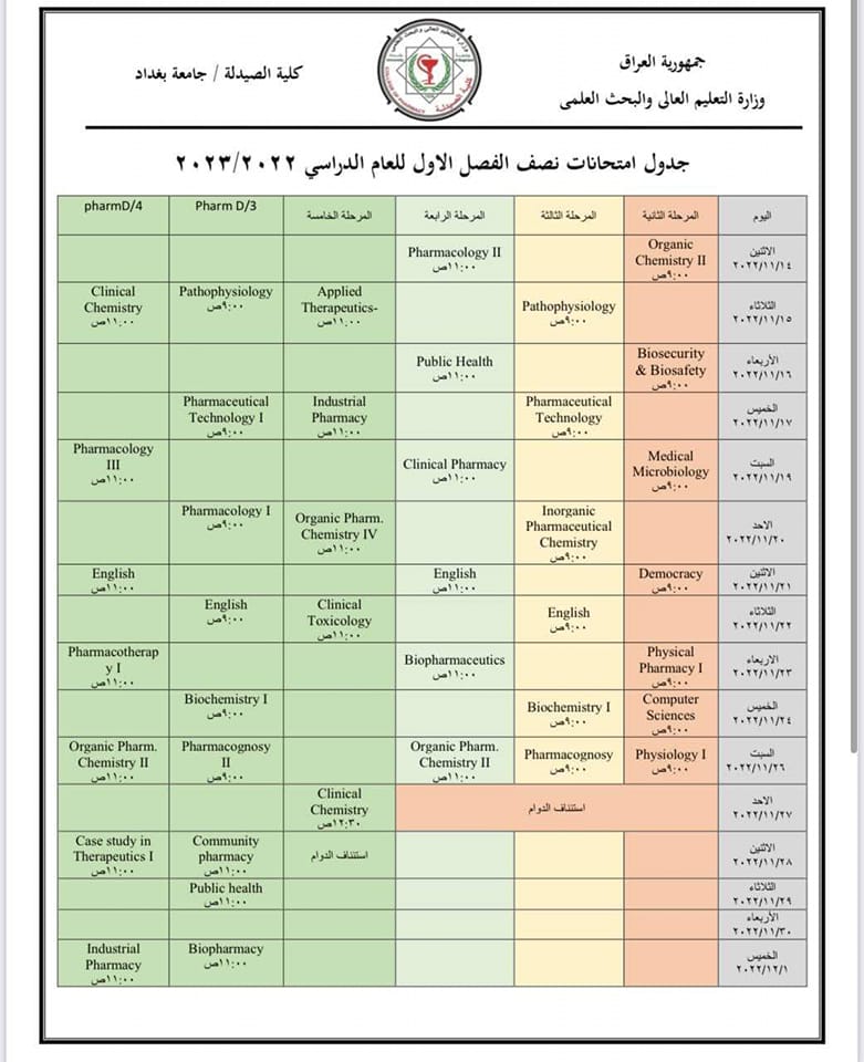 The faculty of Pharmacy – University of Baghdad announces the schedule of Mid term exams for the first semester for the academic year 2022-2023,. Wishing to all dear students success